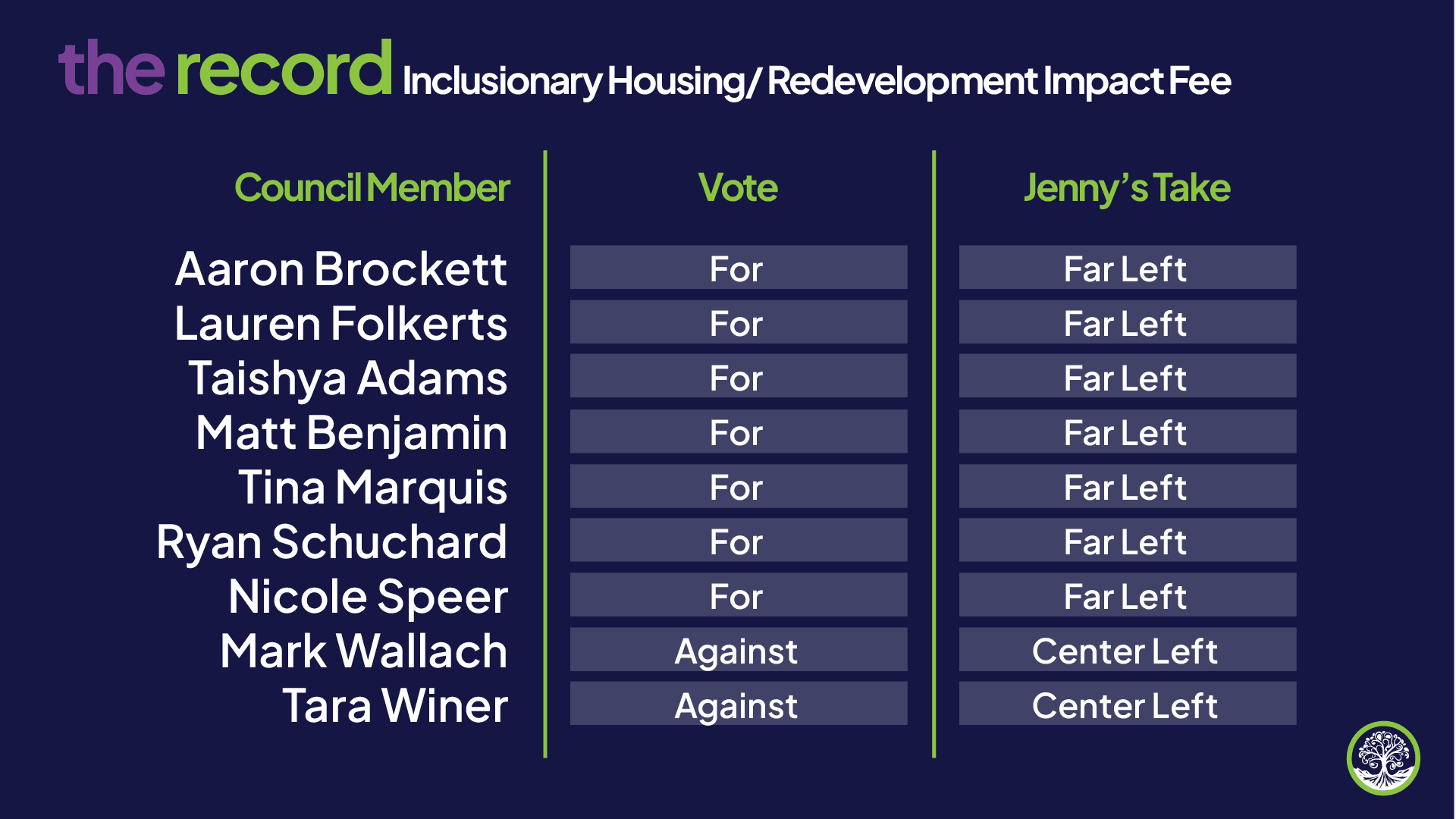This ordinance extends inclusionary-housing requirements into the single-family redevelopment space - an area previously not subject to such fees. Supporters argue it helps offset the loss of smaller, more affordable homes and ensures that wealthier redevelopment contributes to the city's affordability goals.