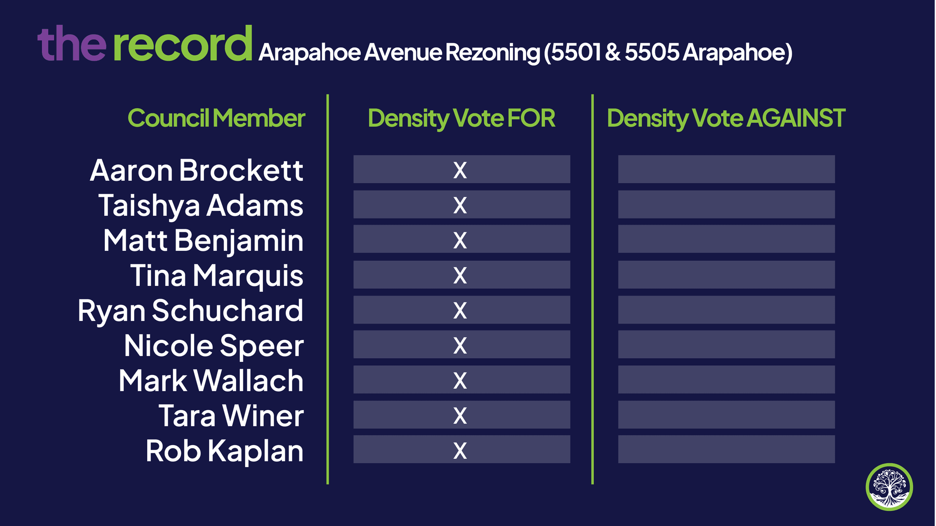 This vote is pro-density. It is less about a single project and more about the continued direction of redevelopment along Arapahoe, where council appears aligned that mixed-use growth should continue.