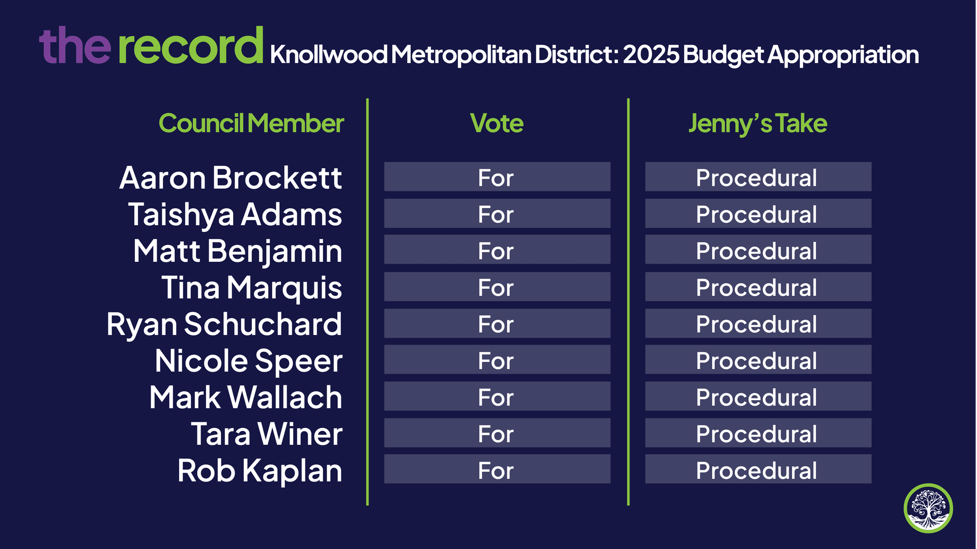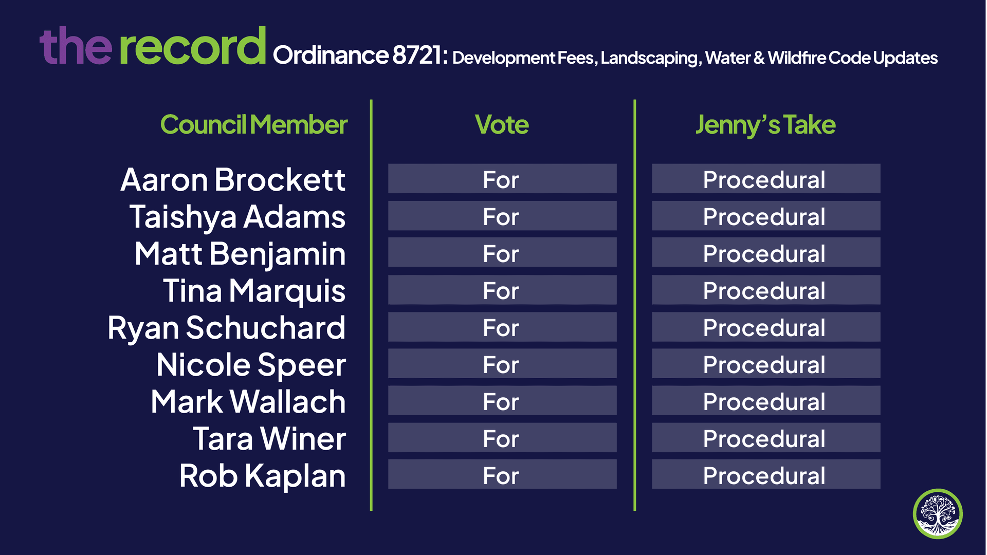 I am classifying all votes as “procedural” because they don’t reflect ideological direction or policy preference. These are staff driven actions Council is required to take to execute existing law, approve contracts, settle litigation, adopt technical code updates, or complete statutory processes like annexations and district budgets. In most cases, any council, progressive or moderate, would vote the same way. Since these votes don’t signal a governing philosophy, they are classified as procedural.